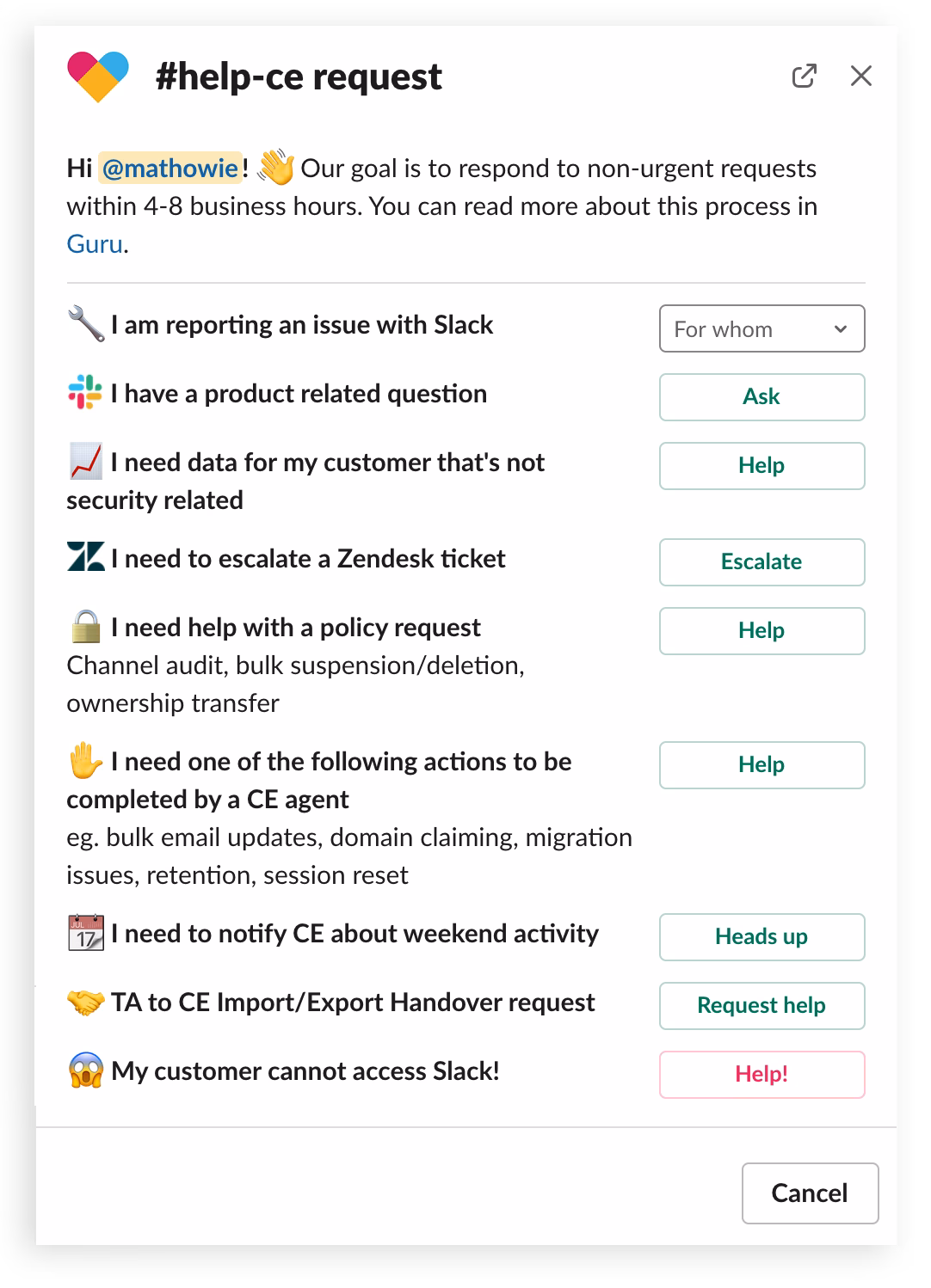 Slack internal team support channel example